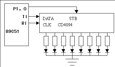 例:用8051串行口外接CD4094扩展8位并行输出口,如图所示,8位并行口的各位都接一个发光二极管,要求发光管呈流水灯状态。 串行口方式0的数据传送可采用中断方式,也可采用查询方式,无论哪种方式,都要借助于TI或RI标志。串行发送时,可以靠TI置位(发完一帧数据后)引起中断申请,在中断服务程序中发送下一帧数据,或者通过查询TI的状态,只要TI为0就继续查询,TI为1就结束查询,发送下一帧数据。在串行接收时,则由RI引起中断或对RI查询来确定何时接收下一帧数据。无论采用什么方式,在开始通讯之前,都要先对控制寄存器SCON进行初始化。在方式0中将,将00H送SCON就可以了。