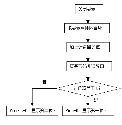 从上面的程序可以看出,和静态显示相比,动态扫描的程序稍有点复杂,不过,这是值得的。这个程序有一定的通用性,只要改变端口的值及计数器的值就可以显示更多位数了。下面给出显示程序的流程图。