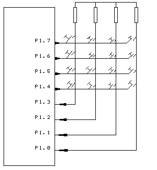 图仍如上所示。8031单片机的P1口用作键盘I/O口,键盘的列线接到P1口的低4位,键盘的行线接到P1口的高4位。列线P1.0-P1.3分别接有4个上拉电阻到正电源+5V,并把列线P1.0-P1.3设置为输入线,行线P1.4-P.17设置为输出线。4根行线和4根列线形成16个相交点。