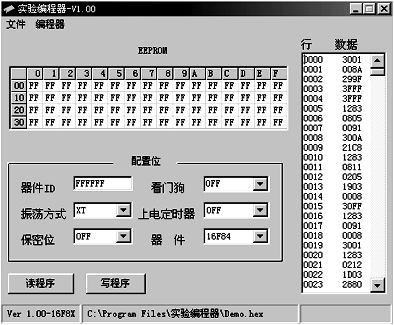 2PIC16F8X V101实验编程器的软件安装 该实验编程器的支持软件共有三张,都是标准软件格式。你只需在PC机视窗WINDOWS下运行即可进行安装。打开PC机,在PC机A驱中插入该编程器的第一张磁盘,用鼠标键点击显示器上“我的电脑”,再点击A磁盘(35英寸软盘),即可打开A:盘窗口,在此窗口上会出现9个文件,只点击其中的STEUPEXE文件即可在PC机上运行该磁盘软件,然后注意操作安装过程中的适当提示语句,PC机会自动地将三张磁盘的软件安装到你选定的硬盘中(笔者是把该软件放在PC机的D盘中)。待安装完毕,可用配套的电缆线RS232插头,一端插入PC机RS232串口(串口1、2、3、4任选)插座上,一端插编程器的RS232插座上。接着在编程器的供电电源口中插入电源适配器(15V~17V,该适配器电源不分极性)和DIP插座上安上PIC16F8X芯片,这时编程的准备工作全部完成,此时电源指示灯LED即亮。
