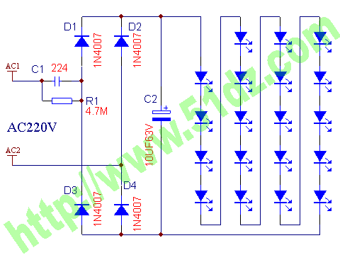 电路原理图:工作原理非常简单,通过电容限流了发光二极管的工作电流小于25MA,加上C2吸收了开关灯的冲击电流,有效的确保了发光二极管的使用寿命。采用电容降压,不消耗电能,不发热,效果好。(发光二极管的工作电流由C1的容量决定,如图最大不能超过474,如果发光二极管的工作电流超过了50MA,估计发光二极管的寿命会大大缩短!如果觉采用224亮度已经太亮,可以换容量为104的电容,这样LED的工作寿命会超过几万小时。)